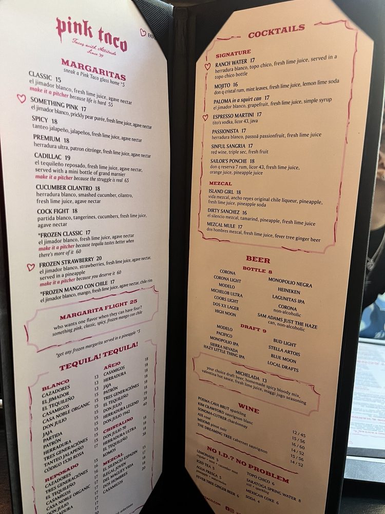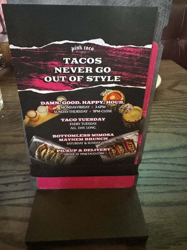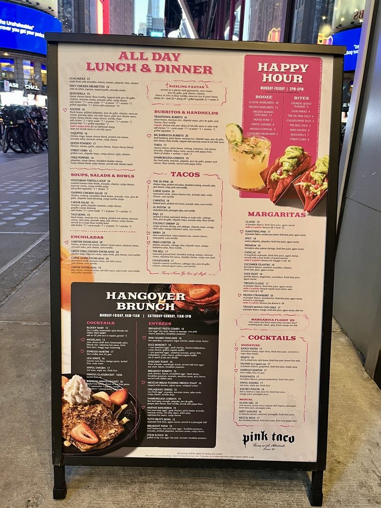Pink Taco is a trendy and casual spot in Times Square, New York, offering a wide selection of tacos, bar bites, and breakfast options. With QR code menus available, convenient parking, and delivery and takeout options, it's a great choice for groups or a casual dinner. The menu features fresh guacamole, spicy chicken drumettes, cheesy quesadillas, and loaded nachos for sharing. Their sizzling fajitas are a popular choice, served with all the fixings for a customizable meal. Customer reviews praise the friendly service and recommend dishes like the Paloma cocktail, el pastor quesadilla, and coconut shrimp tacos. Despite some mixed reviews on service, Pink Taco stands out for its vibrant atmosphere, tasty Mexican fare, and lively happy hour specials. A must-try for those looking for a fun and delicious dining experience in the heart of NYC.